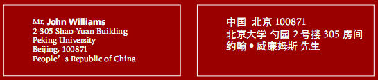 以上是以住在勺园为例,如果住校外,一定要向房东问清楚你住处的准确地址和邮政编码。