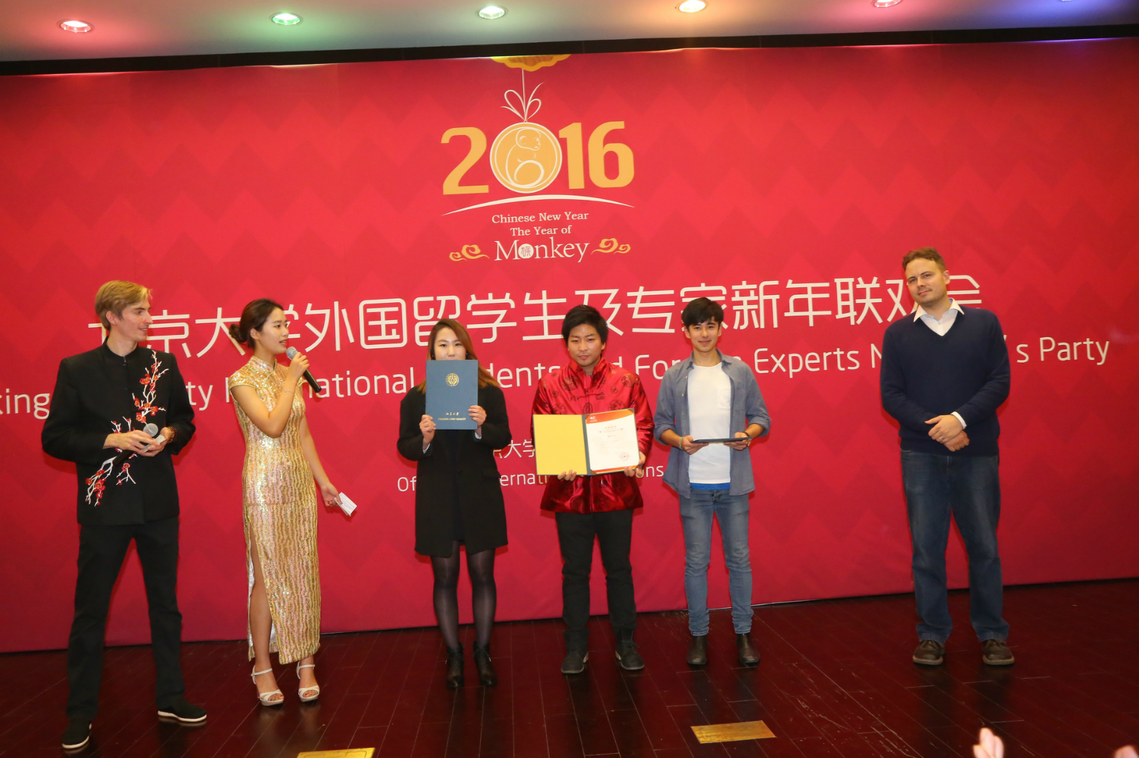 回顾2015年,收获颇多,北京大学国际合作与交流取得了丰硕的成果,第十二届国际文化节的成功举办向校内外人士展示了北大国际校园的魅力和风采。联欢会上,嘉宾向获得最佳展台、最佳美食和最佳表演奖的同学颁奖。