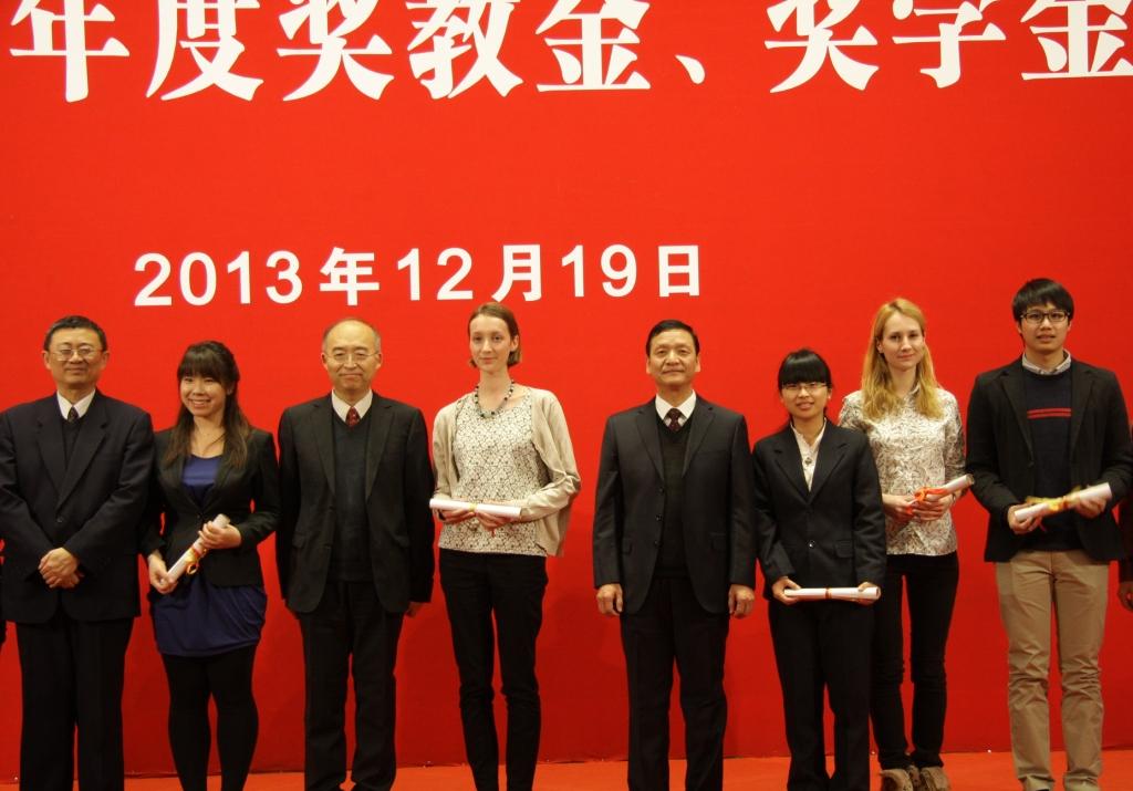 2013年12月19日下午,北京大学2013年度奖教金、奖学金颁奖典礼在英杰交流中心阳光厅举行。北京大学校长王恩哥,常务副校长吴志攀、刘伟,副校长王杰,党委副书记叶静漪,副校长高松等共同出席本次典礼,留学生办公室组织部分留学生获奖代表参加并上台领奖。