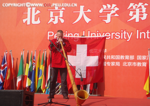 上午的倒数第二个节目是瑞士传统音乐。一位来自瑞士留学生抬着一个酷似“大烟斗”的乐器上台,引得观众十分好奇。原来,这是瑞士一种传统乐器,看似笨重,却能发出浑厚悠扬的乐声。在简短的自我介绍后,这位留学生开始专心吹奏“大烟斗”。美妙的音乐回荡在广场之上,让原本热闹的观众席慢慢安静下来。