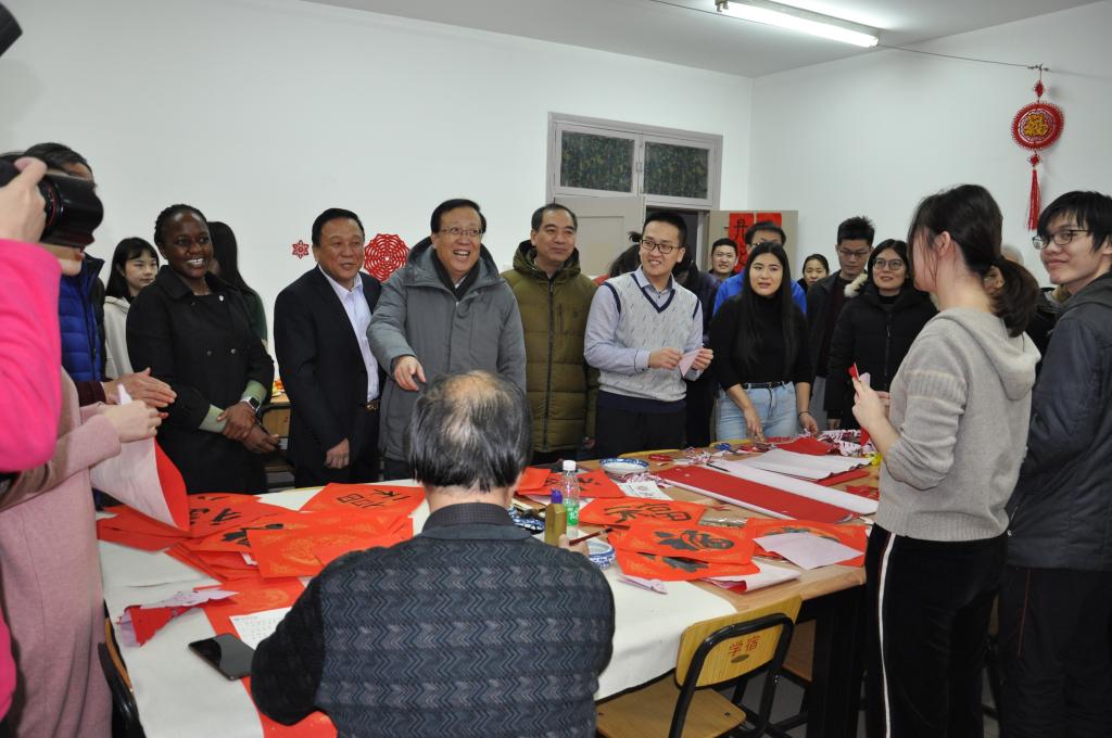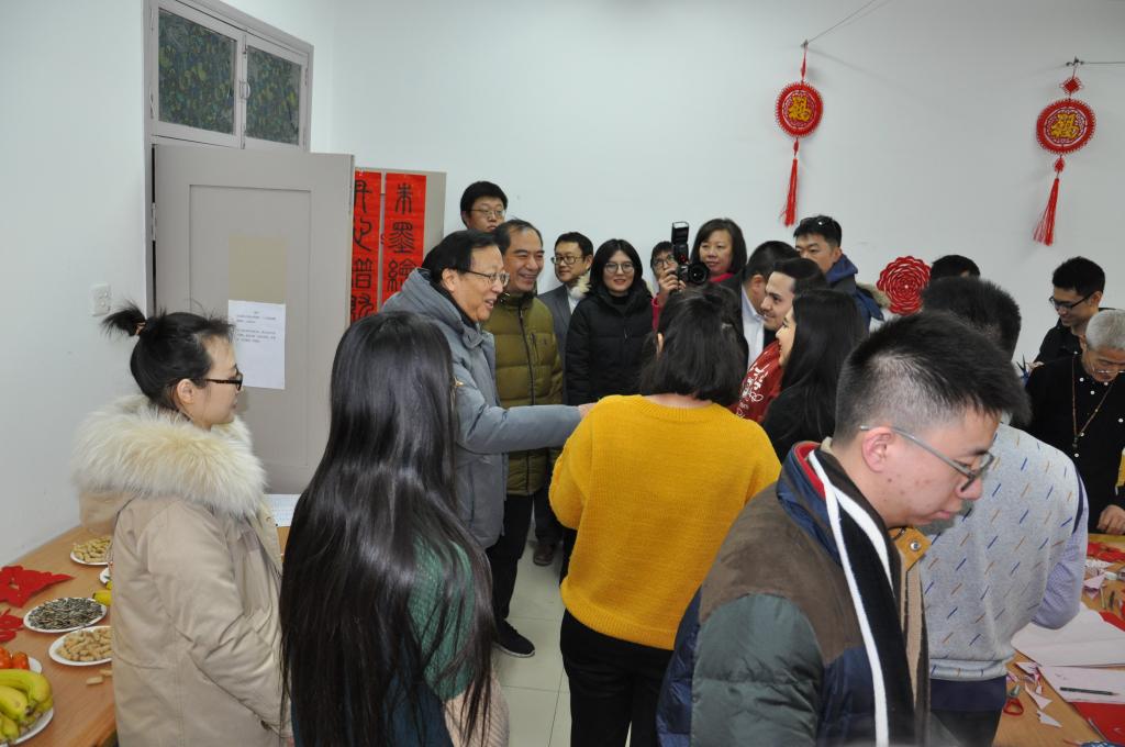 下午2点多,校领导一行来到39楼宿舍,看望正在参加联欢活动的学生。郝平校长向在场的师生拜年,他表示,你们在北大过年,学校非常关心,为大家安排了相关活动,希望你们开开心心过好年,多和家里通电话,向家里介绍这边的情况,把学校的问候带给家人。他还亲切询问了几位留学生的国籍,了解他们在这里的学习和生活,并和他们交流他们家乡的情况,祝他们在北大学习和生活顺利。他指出,中外学生融合很重要,大家一起联欢,效果非常好。