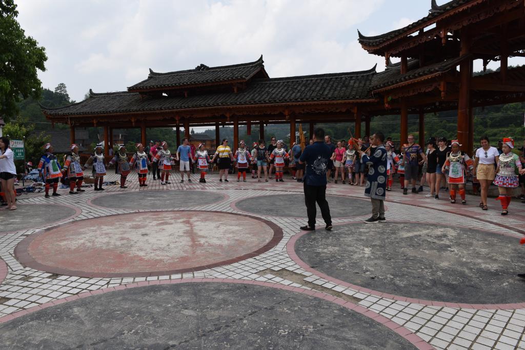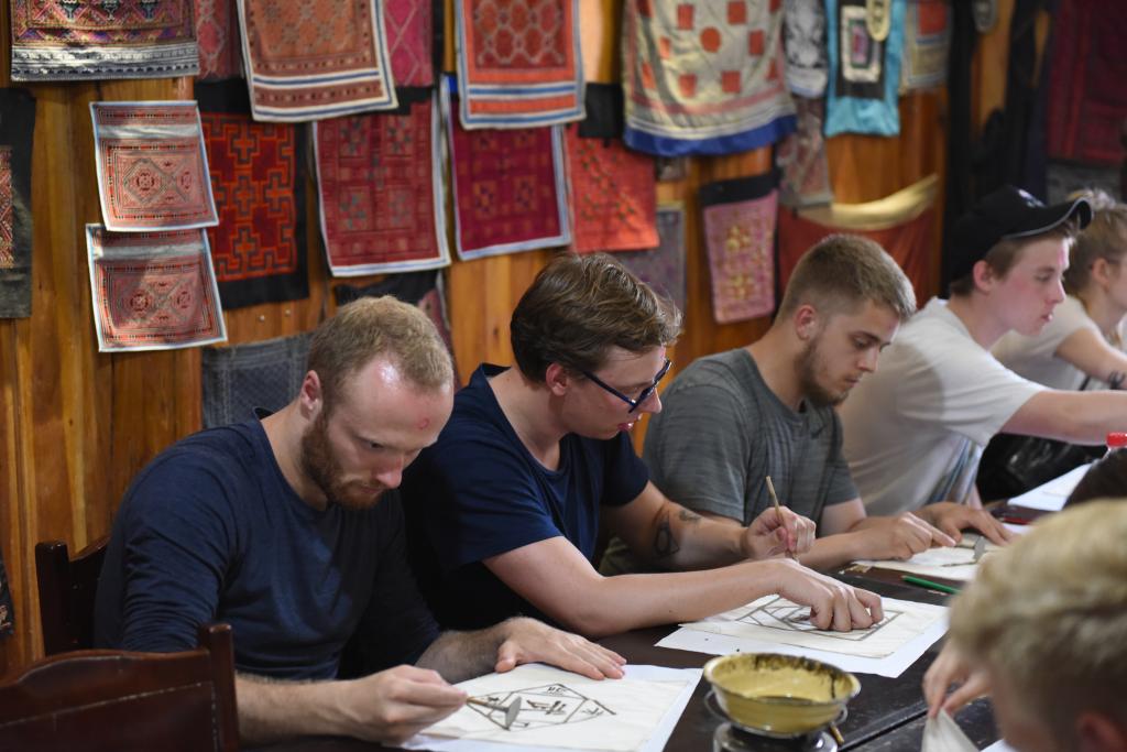 抵黔当晚,在“多彩贵州风”大型民族歌舞晚会现场,黄果树瀑布、万峰林等自然景观的视频展示让大家的身心瞬间就融入到满目滴翠的青山绿水间,充分领略到贵州秀丽而壮美的大好河山。通过《水姑娘》《苗绣》《踩鼓》《瑶族抛花包》《彝族跳菜》《水族斗牛》《布依族跳花会》《土家族摸红》等美轮美奂的节目表演和热烈互动,同学们感受到了中华民族大家庭的多姿多彩。次日在位于黔东南苗族侗族自治州的麻塘革家寨,一个传说由射日英雄后羿的后代聚居而成的美丽村寨,同学们跟村民一起翩翩起舞、尽情歌唱,并在革家手艺人的教学下亲手体验了革家蜡染手艺。革家蜡染历史悠久,古朴大方,多以花鸟鱼虫等为内容,充分反映出革家人对美好生活的向往和对大自然的热爱。通过讲解和实地参访,同学们了解到在政府和社会各界帮助下,当地通过发展旅游业实现精准扶贫、精准脱贫的良好成效。