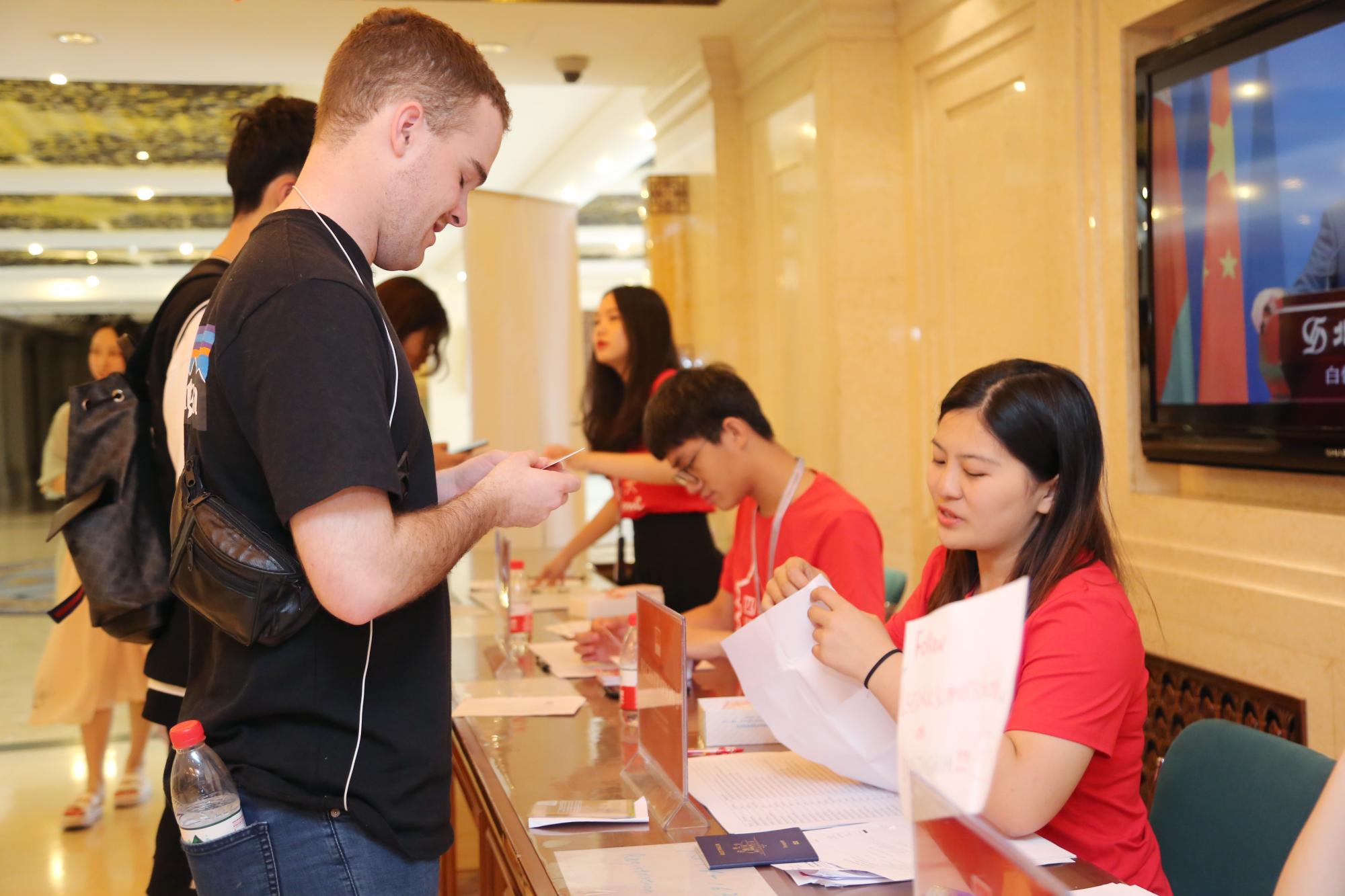 8月4日上午,LSE-PKU暑期学校在英杰交流中心举行报到注册以及开学典礼。中午12点,暑期学校的报道注册环节正式开始。身穿“留学北大”logo红色T恤的助理团队紧锣密鼓地进行着报道注册工作,他们分工明确,协调有序。前来报道注册的学生们首先在助理的引导下查找学号,之后井然有序地前往各个柜台领取信息确认单、校园卡、项目定制手提袋、T恤以及课程阅读资料,完成所有流程后便进入阳光厅内安静等候参加开学典礼。助理们热情洋溢地同来自五湖四海的同学们打招呼,细致耐心地为学生答疑解惑,注册流程高效有序。
