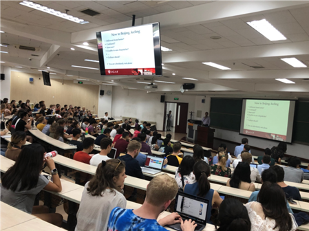 四海学子,扬帆启航。随着北京大学研究生教育国际化程度的日益深化,2019年新学期伊始,北京大学又迎来了一批来自世界各地的全英文授课留学生研究生。为了帮助他们更好的适应在北大的学习生活,研究生院和留学生办公室联合为同学们举办了一场全英文授课研究生培养说明会。9月2日下午,留学生全英文授课研究生培养说明会在理科教学楼107举行,近200名2019级留学生研究生同学参加了此次说明会。