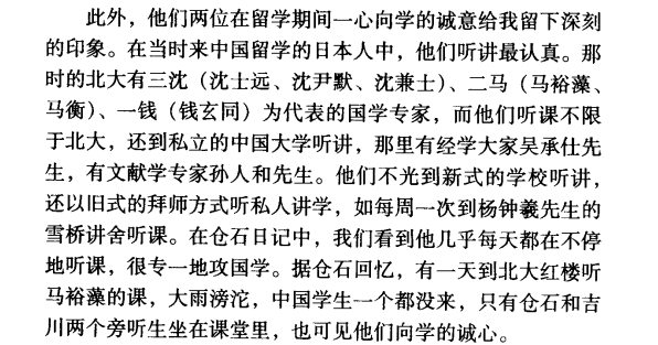 *该片段记录了仓石武四郎先生与同学于 1928 年到 1930 年在中国的留学生活,里面提及在北大听课的情景。仓石武四郎是国立东京大学名誉教授,中国语学文学研究家。1928-1930年被日本文部省派往北京留学。他的学生工藤篁(日本著名汉学家)是北京大学 1980 年代著名留学生校友尾崎文昭先生在东京大学汉语老师。尾崎文昭1980年-1983年在北京大学中文系留学,曾任东京大学东洋文化研究所教授。该素材也从侧面体现了东京大学三代汉学家与中国、与北大的深远渊源。
