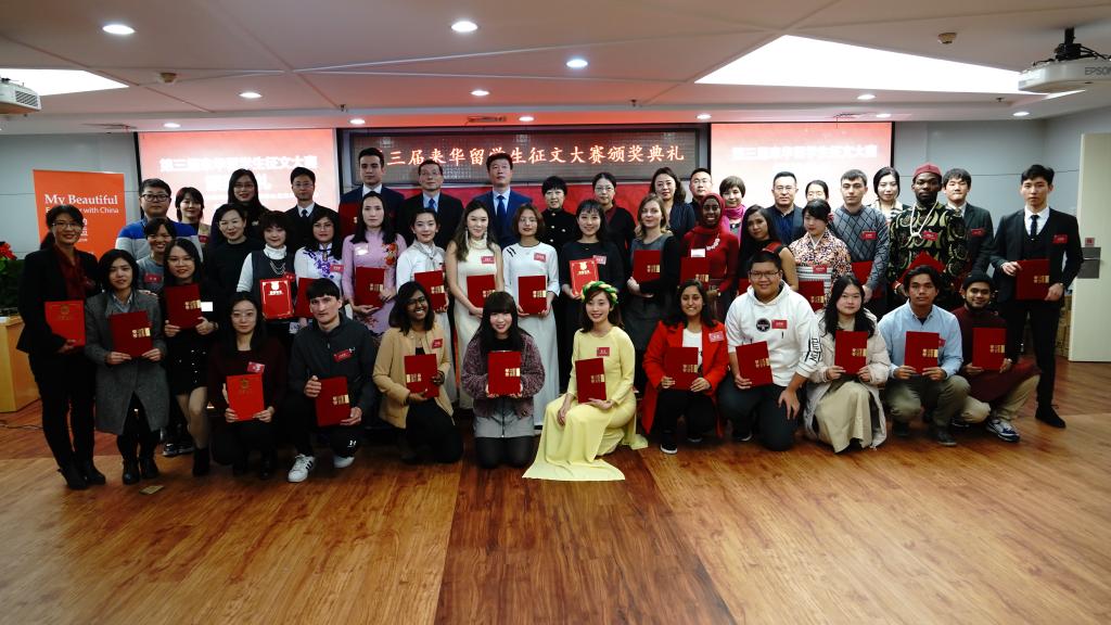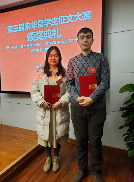 2019年12月20日,第三届来华留学生征文大赛颁奖典礼暨《我与中国的美丽邂逅——来华留学生见证壮丽70年》新书发布仪式在北京成功举办。此次活动由教育部国际合作与交流司主办,教育部留学服务中心承办。征文大赛于2019年5月正式启动,大赛组委会共收到来自80余所院校机构及个人投稿,共计670余件,最终评出一等奖5名、二等奖8名、三等奖16名和优秀奖31名。获奖作品以中文写作,文章流畅优美,内容丰富多彩,并以《我与中国的美丽邂逅——来华留学生见证壮丽七十年》为书名结集出版。