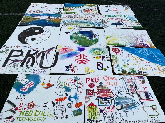 随后的合作绘画环节,一张无限可能的白纸加上同学间的思维碰撞,色彩交融间,个性与共性得到了完美体现。或是爱好,或是美食,或是象征来处,或是寓意祝愿,鲜明的个人元素汇聚在一起,却是意外的和谐。“未名”“博雅”组在太极图上写下各自的国家名称,意为来自世界各地的同学在中国包容万物的阴阳平衡中达到融洽;另一幅画中,同学们在地球上画上了各地的标志性事物和一条贯通的铁路,不仅表现了同学对人类命运共同体的深刻理解,也体现了“一带一路”倡议在全球合作中的积极作用。其他画幅中,极具艺术感的水彩线条在白纸上纵横交织,最终汇于一处,寓意不同文化背景的同学汇聚北大,在这里书写自己的人生,这不仅与北大兼容并包的特点相合,也是同学们对北大精神的解读与延伸。而“天”组以舒展的树干穿过“PKU”一词,并加以各色枝叶,具象化同学们扎根于北大这片学术的沃土,努力吸取知识养分,实现梦想的美好愿景。