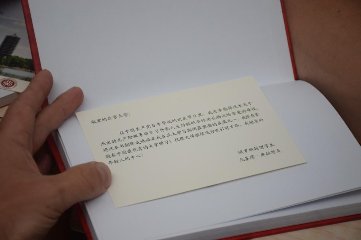 尼基塔向学生记者展示自己赠予北京大学的译作