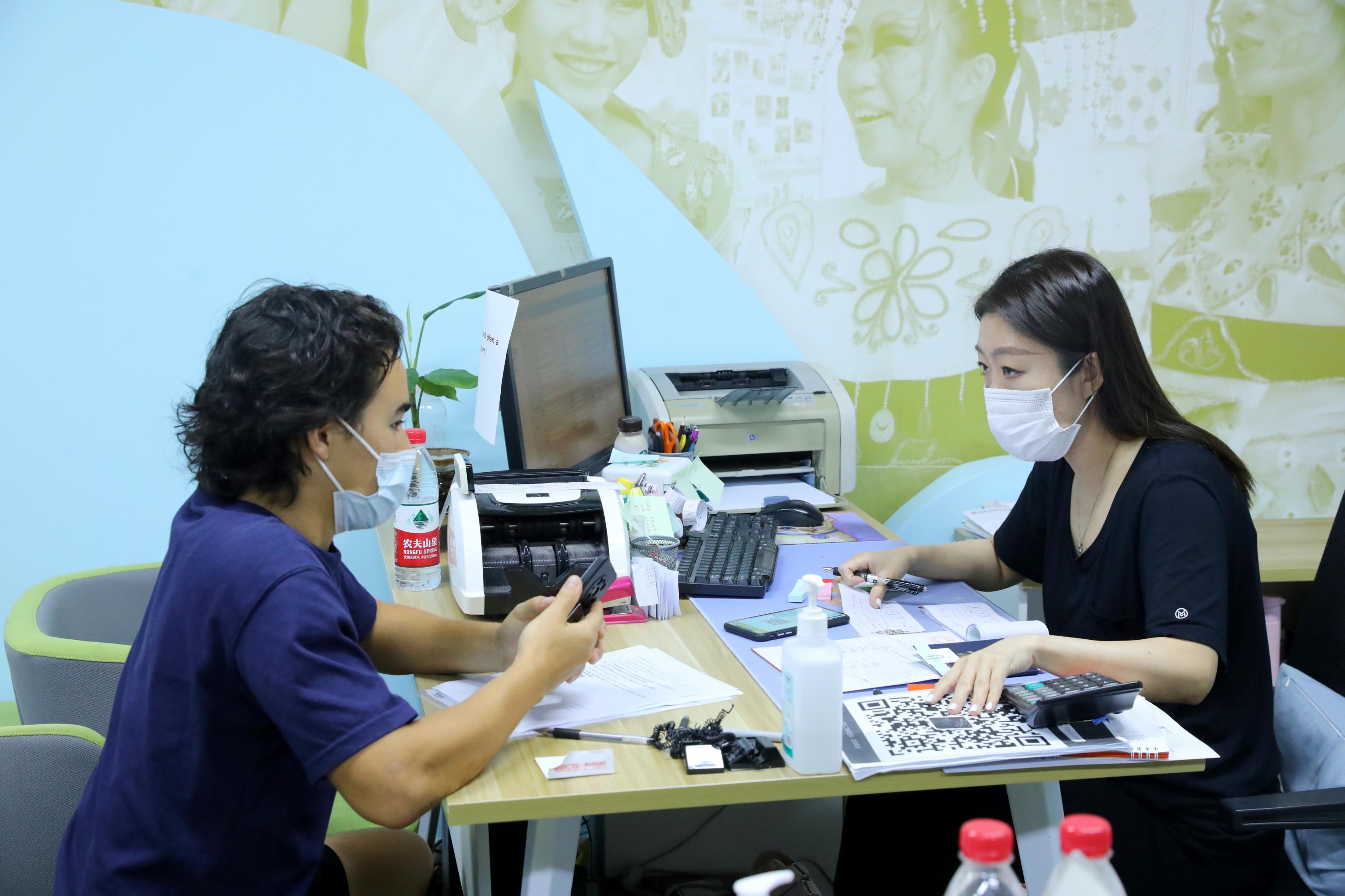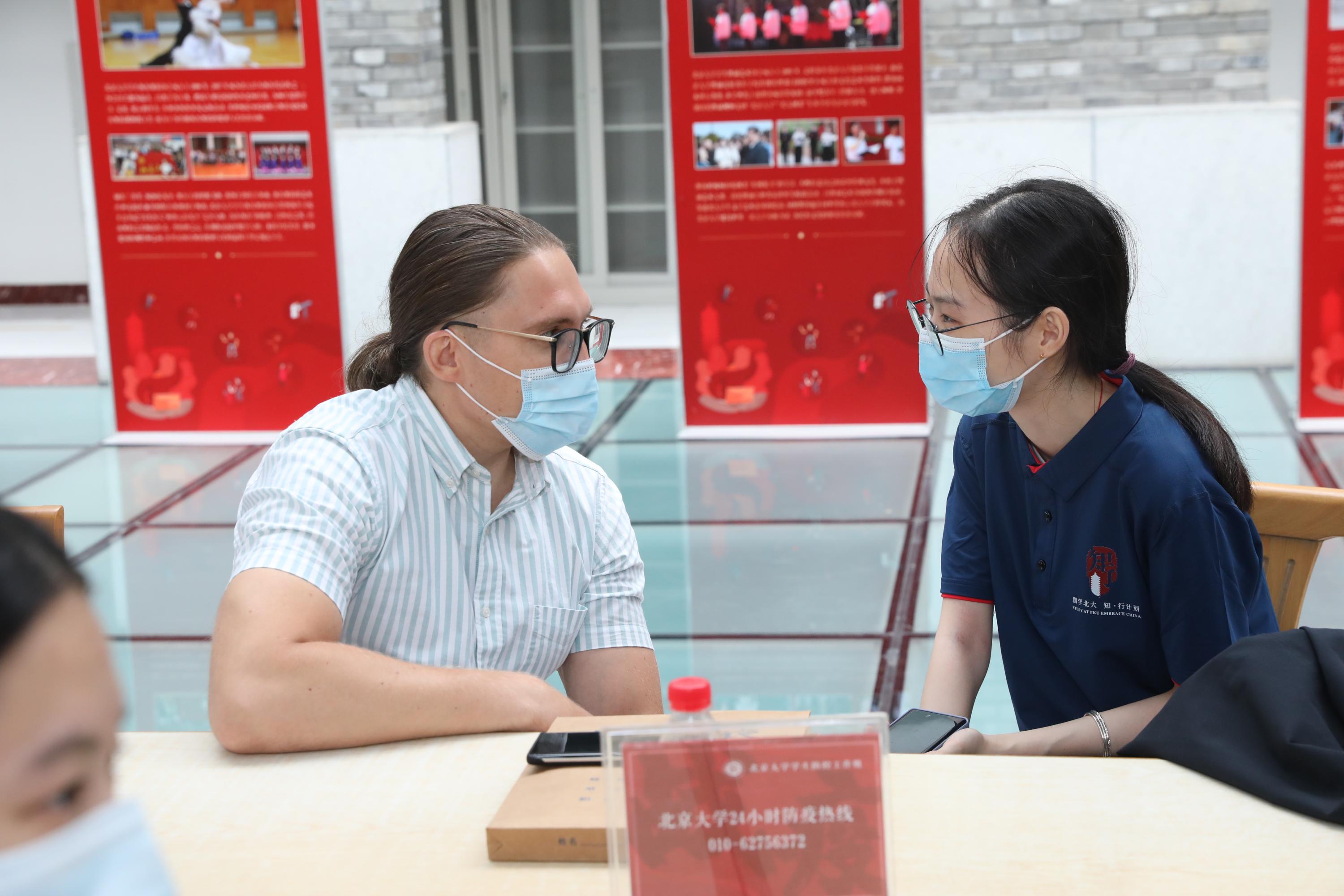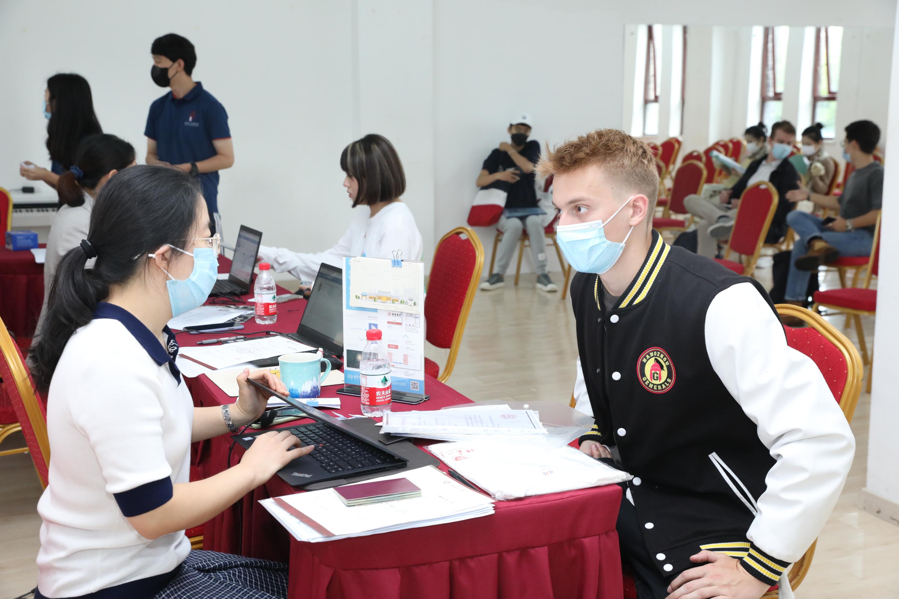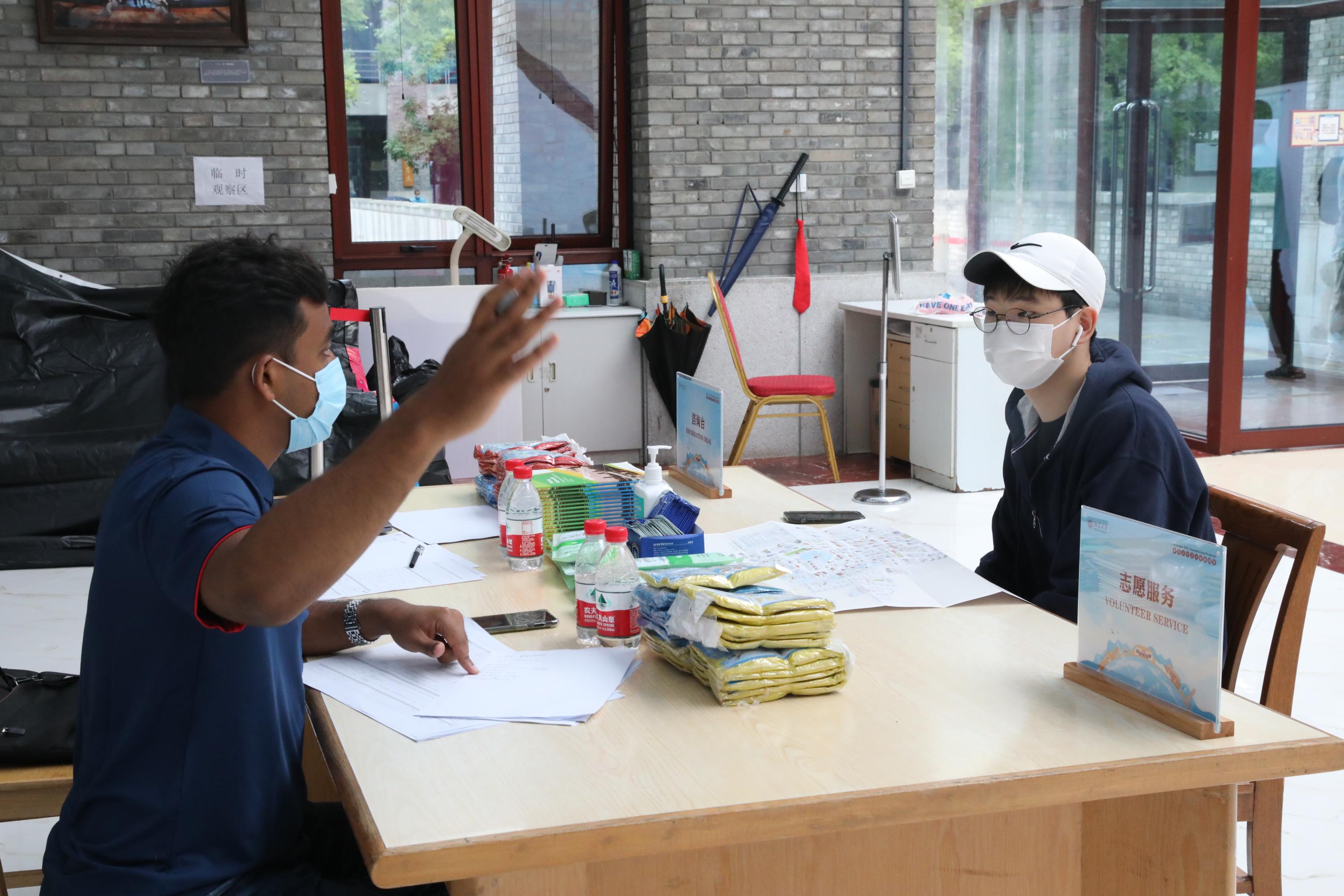 线下迎新环节既方便快捷也温暖周到。留学生办公室在新太阳中心门口设置志愿者咨询台,来自孟加拉的元培学院本科生阳光(SUNNY,MD MAHEDI HASSAN)和来自乍得的国际关系学院博士生托马(DONGLONA ADAWA,THOMAS)作为留学生学长,早早地就守候在门口为前来报到的新同学答疑解惑。新太阳中心三层专设线下注册办公室,志愿者协助老师帮助线下留学生进行报到注册,还专设为留学生办理签证、保险和缴纳学费手续的区域,并根据疫情防控要求,为等待的同学们布置了室内外休息室。办理完成注册和相关业务后,新生同学可以回到一楼大厅,在这里领取新生训练营专属服装和新生生活指导手册,办理住宿手续。
