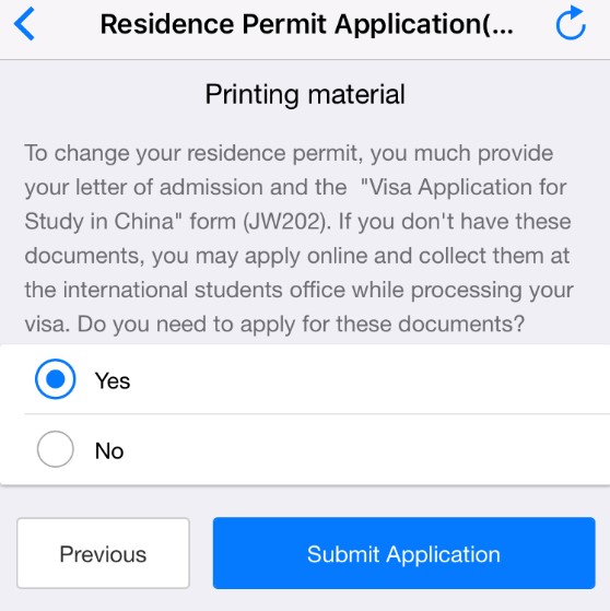 4、按要求核对护照信息、填写或上传入境章、签证页、临时住宿登记表、学费和医疗保险等信息,并可根据需要申请录取通知书和JW202表。提交申请。