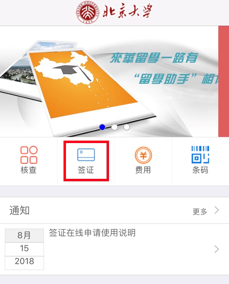 1、进入“留学北大”App,选择“签证”,进入签证申请页面