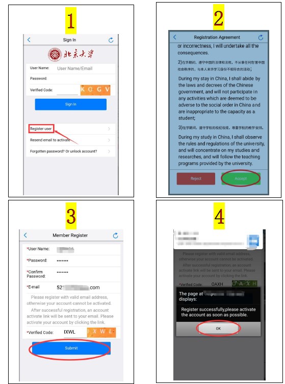 3、注册新账号或输入入学申请时使用的用户名及密码,