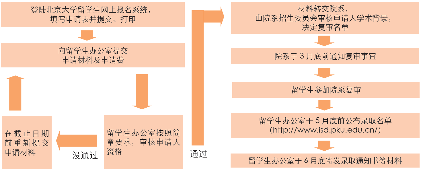 1. 北京大学外国留学生入学申请表(研究生)。请登陆北京大学留学生网上报名系统(网址: http://www.studyatpku.com)进行网上报名,报名成功后打印申请表,并贴最近的照片;