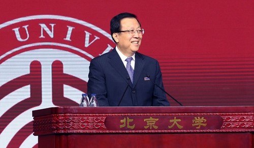 Hao Ping, Chair of the Peking University Council and host of the commemorative celebration, reading aloud the congratulatory letter that the university received from Li Keqiang, Premier of China.