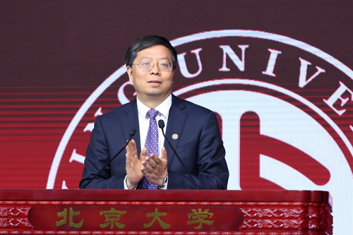 Lin Jianhua, President of Peking University, delivers a speech on the topic of "Universities are a Bridge to the Future"