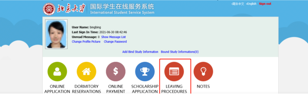 Step 2: Register a new account or use the existing account of your admission application. Then, click "Leaving Procedures" and bind your student ID.