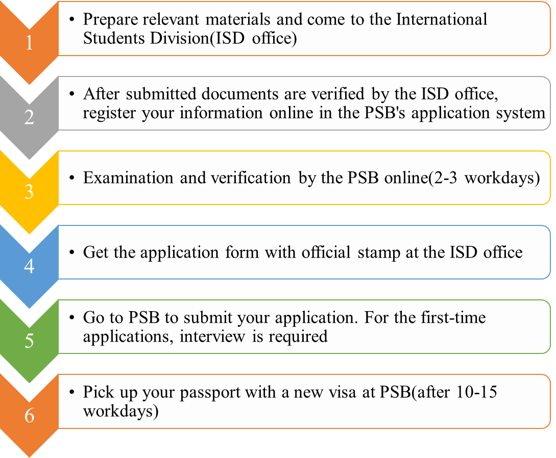 1. International students must hold a residence permit for study or X2 short-term study visa to study at the school. It takes 8 to 15 weekdays to go through the relevant procedures of the residence permit for studies, and 8 to 13 weekdays to process the X2 visa related procedures. Under normal circumstances, an application must be submitted within 30 days before the expiration of the visa, with time reserved, all necessary materials prepared, validity of the temporary accommodation registration in-formation confirmed, and relevant procedures completed on time.